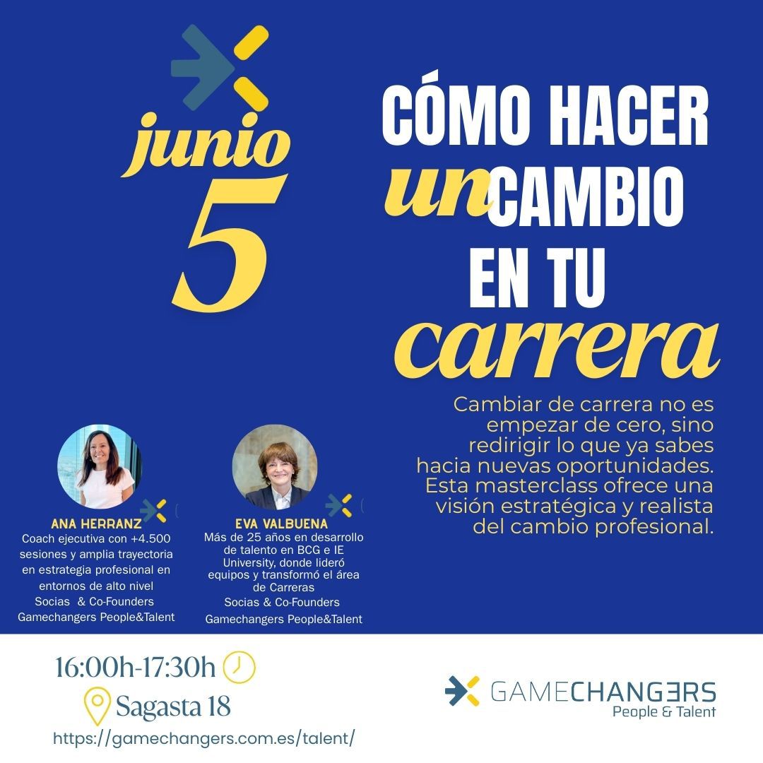 Redirige tu carrera hacia nuevas oportunidades Cambiar de carrera no significa empezar de cero, sino aprovechar todo lo que ya sabes para abrir nuevas puertas. Esta masterclass te ofrece una visión estratégica y realista para dar el siguiente paso en tu desarrollo profesional. Fecha: Viernes 5 de junio Hora: 16:00 – 17:30 Lugar: Sagasta, 18 – […]