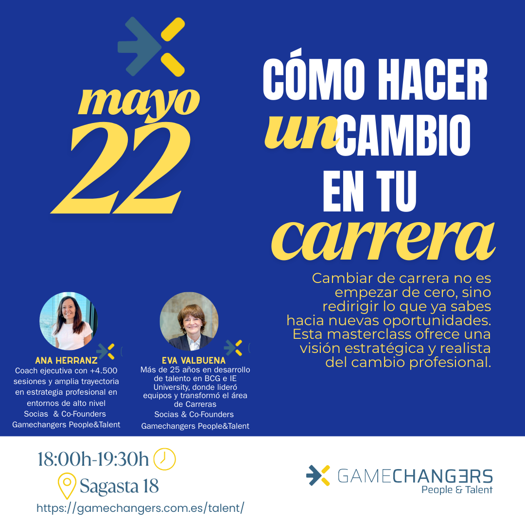 Redirige tu carrera hacia nuevas oportunidades Cambiar de carrera no significa empezar de cero, sino aprovechar todo lo que ya sabes para abrir nuevas puertas. Esta masterclass te ofrece una visión estratégica y realista para dar el siguiente paso en tu desarrollo profesional.  Fecha: Viernes 22 de mayo  Hora: 18:00 – 19:30  Lugar: Sagasta, 18 – 1º izquierda […]
